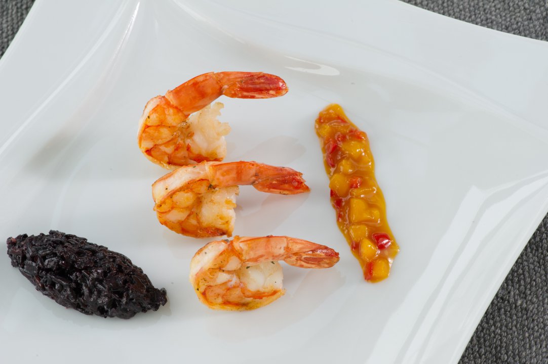 Die Garnelen in einer heißen Pfanne mit Rosmarin und Knoblauch beidseitig scharf anbraten. Anschließend die Pfanne vom Feuer nehmen und noch etwa 3 Minuten leicht nachziehen lassen. Risotto und Chutney auf den angewärmten Tellern verteilen und mit den Garnelen anrichten.