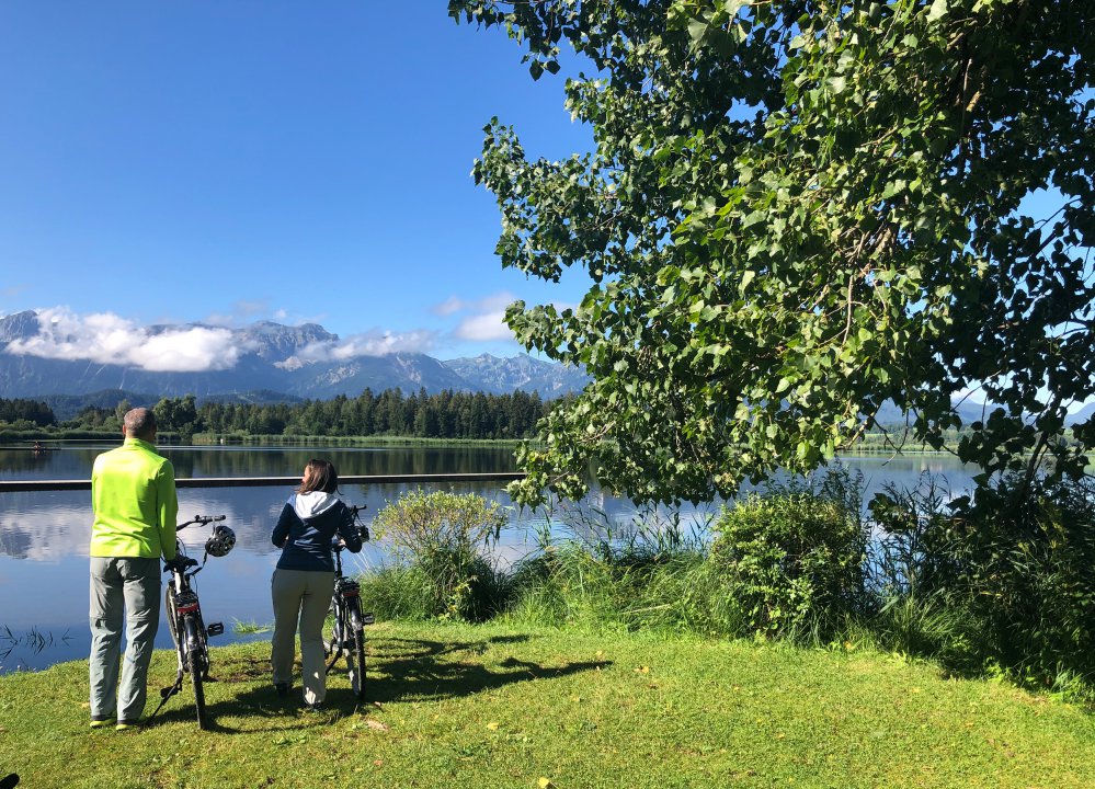Ein ca. 30minütiger achtsamer Abend-Spaziergang ab dem Hotel zur Hopfener Burgruine – der ältesten Steinburg des Allgäus. Von hier oben hat man den schönsten Blick über das Füssener Land. Der Blick schweift über den Hopfensee, über die gesamte Bergkette der Ammergauer, Tiroler und Allgäuer Alpen bis hinüber zu den beleuchteten Schlössern Ludwigs II.. Zurück geht es am Hochmoor vorbei durch den Wald, wo einem nicht selten Eichhörnchen, allerlei Insekten und Rehe über den Weg laufen (manchmal allerdings auch das eine oder andere „Rindvieh“…).