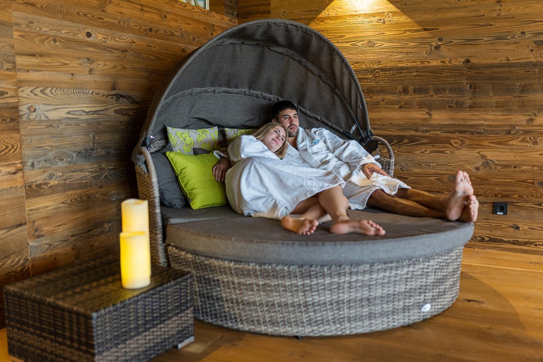 In den Bademantel kuscheln, Wellness-Tasche schnappen und dann erst einmal den Wellnessbereich erkunden. In einem der großzügigen Ruhebereiche findet sich bestimmt ein Lieblingsplatz: Neben den vielen Relax-Liegen gibt es Liege-Inseln und Hänge-Schaukeln speziell für Zwei, die sich mögen. Wärme auf der Haut tut in der kalten Jahreszeit besonders gut. Die finnische Sauna punktet mit Salz-Steinen, Zirbenholz und Gartenblick. Ganz Mutige wagen ein kurzes Bad im Natur-Schwimm-Pool im Wellness-Garten. Für sanftere Naturen sind Bergkristall-Dampfbad, Infrarot-Kabine und Bio-Sauna besser geeignet.