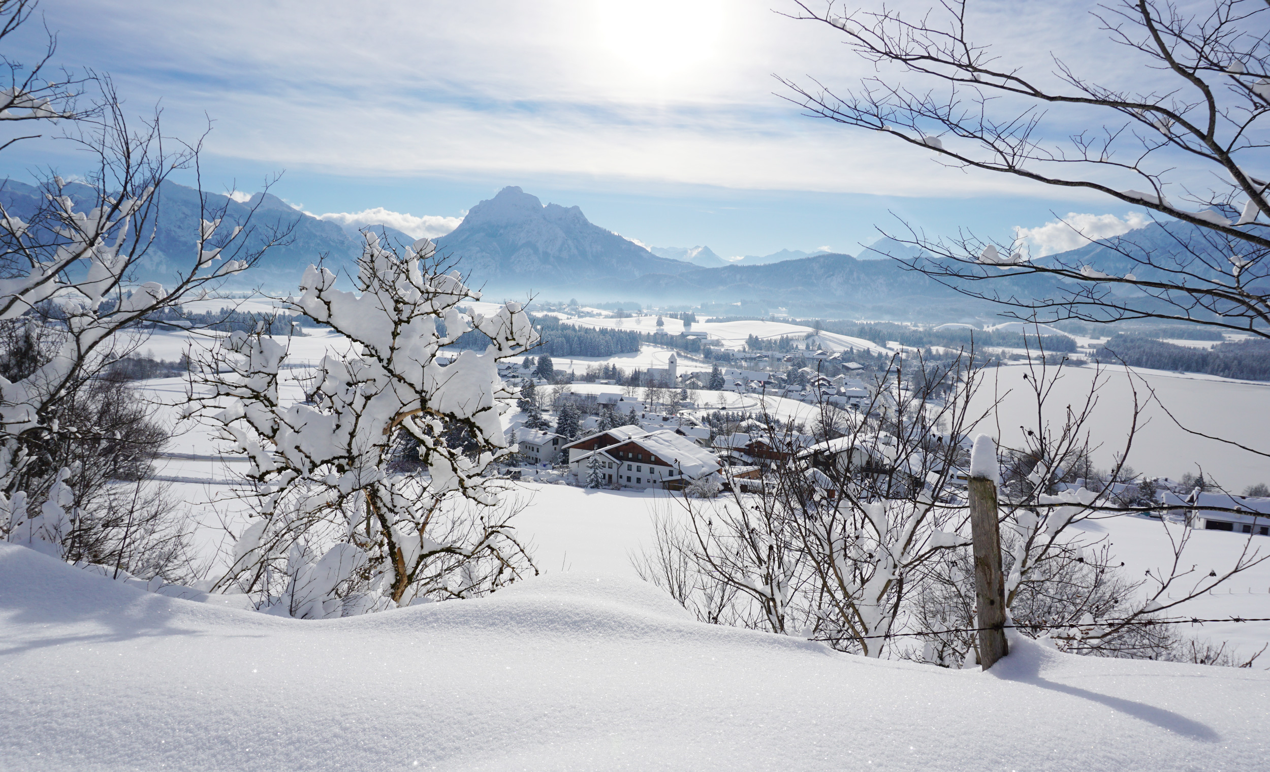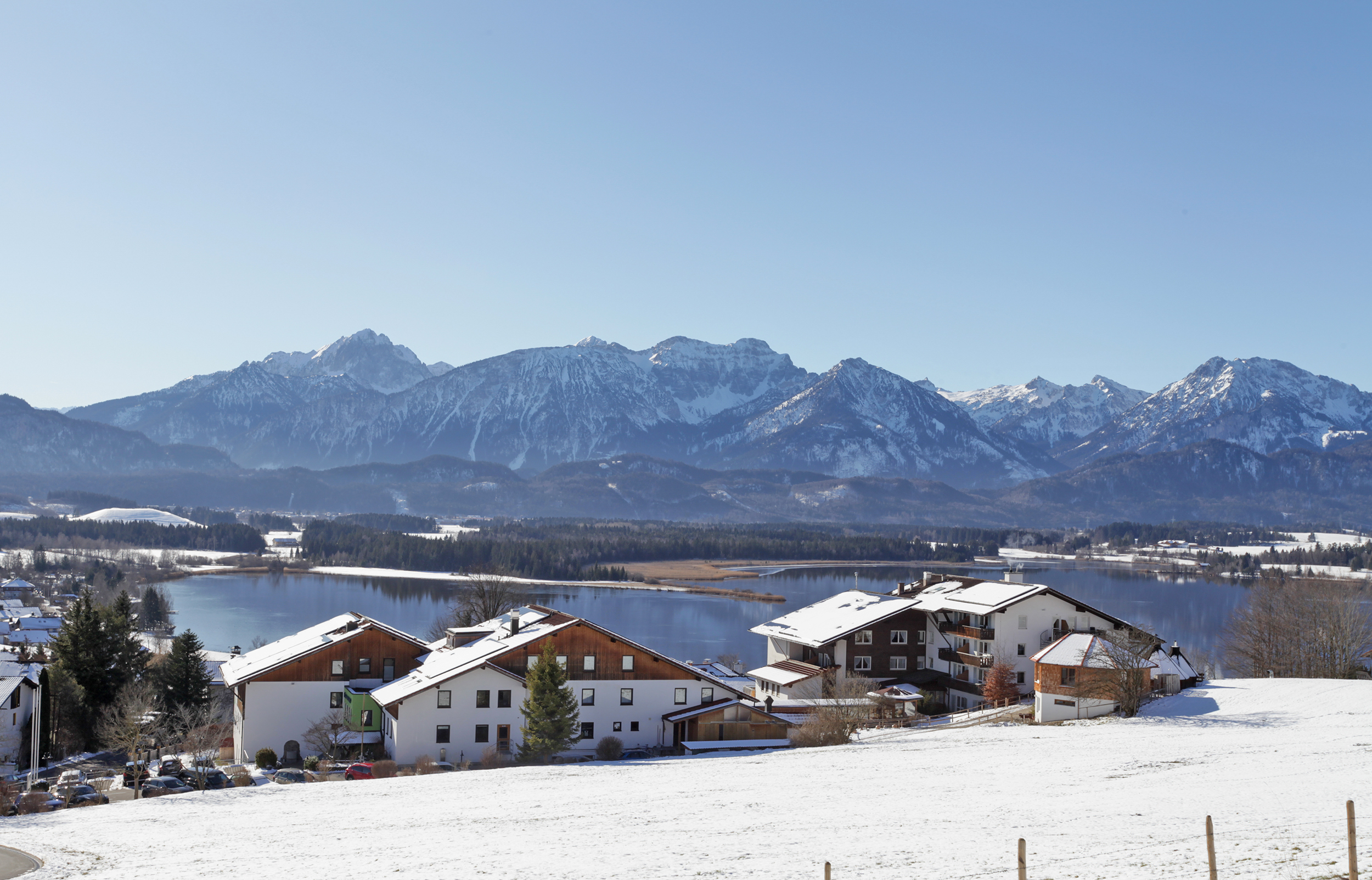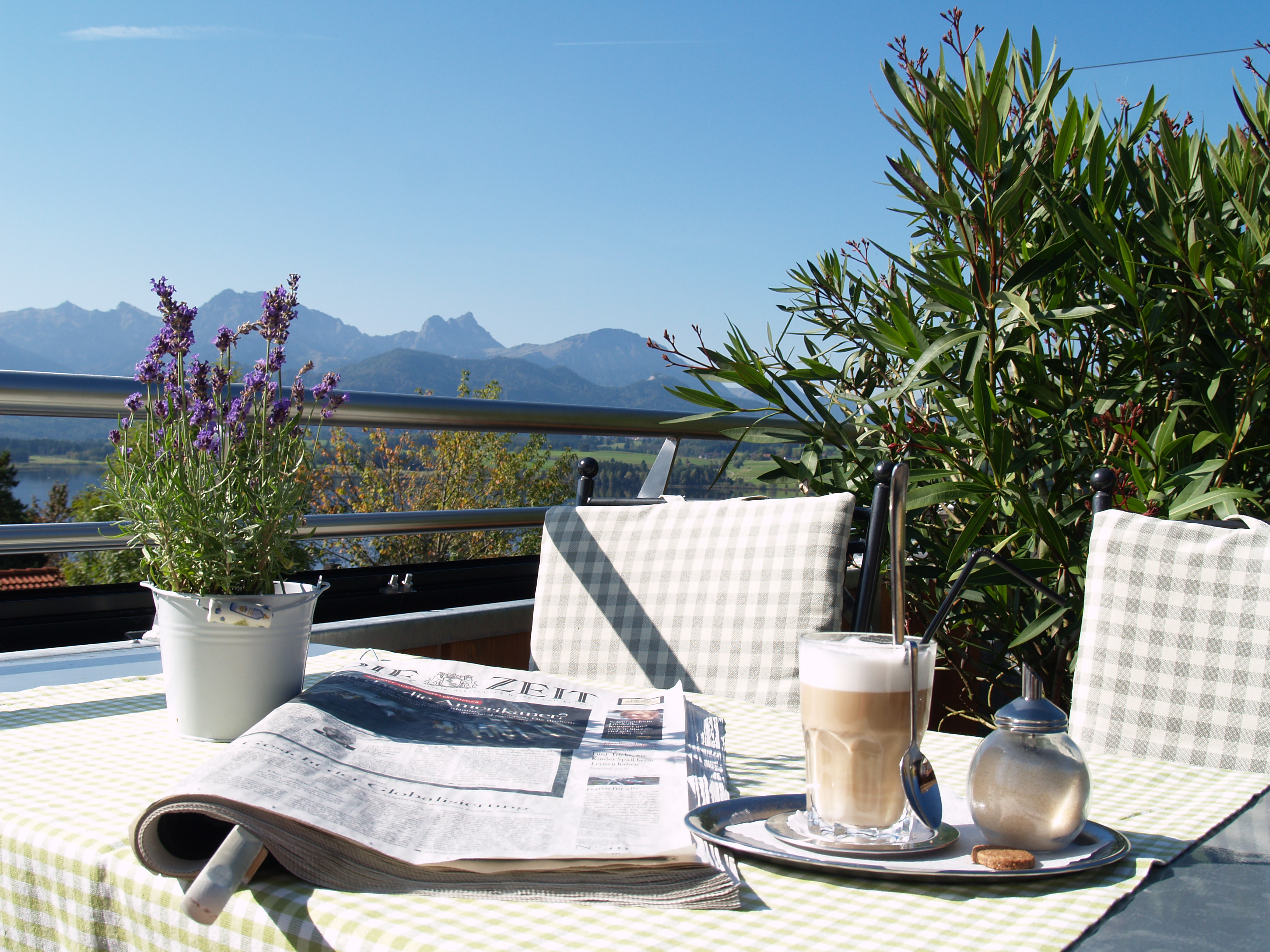 Terrasse mit Ausblick auf Hopfensee und Berge