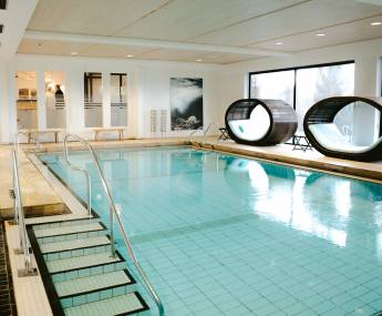 - Hallenbad: Das beheizte Becken mit Gegenstromanlage ist 10 x 5,5 m groß und 1,30 m tief. Hier können Sie schwimmen oder auf den Panorama-Ruheliegen die Sonne und Wärme genießen.